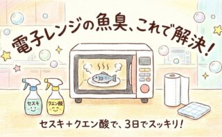 電子レンジの取れない魚の臭いを取るために、激落ちくんのセスキスプレーとクエン酸スプレーを使用して対策。キッチンペーパーで拭いたら汚れがごっそり…3日で臭いがかなり落ち着いた掃除の流れを体験談で解説。